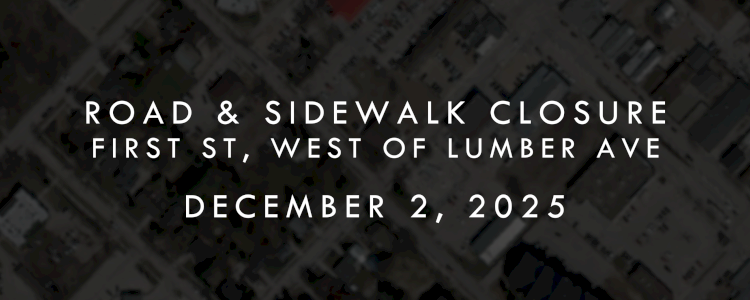 The City of Steinbach would like to inform the public that on Tuesday, December 2nd starting at 9:00am, there will be a temporary road and sidewalk closure on a portion of First Street west of Lumber Avenue to complete necessary tree removal in the area. The road and sidewalk are scheduled to reopen by 4:30pm.