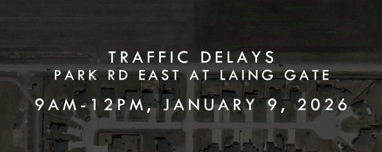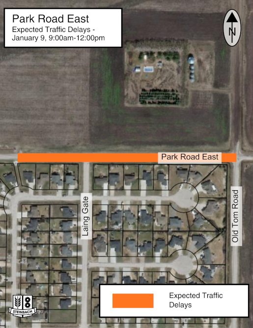 The City of Steinbach would like to inform the public that tomorrow morning, Friday, January 9th starting at 9:00am until 12:00pm, there will be traffic delays expected on a portion of Park Road East approaching Laing Gate to complete necessary snow removal in the area. The work is expected to be completed by 12:00pm.